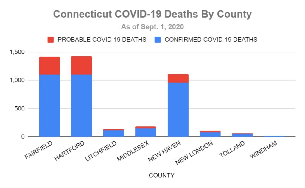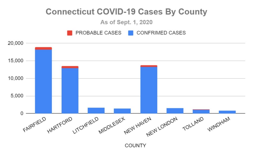 New Haven County experienced the second-most cases, followed by Hartford County. New Haven’s case number is up to 13,266 confirmed and 445 probable, while it has 959 confirmed COVID-19 deaths and 150 probable. Hartford logged 12,870 confirmed cases and 659 probable, and has 1,104 confirmed COVID-19 related deaths and 321 probable, along with 15 hospitalizations. New Haven’s hospitalizations are just above Hartford’s at 17.