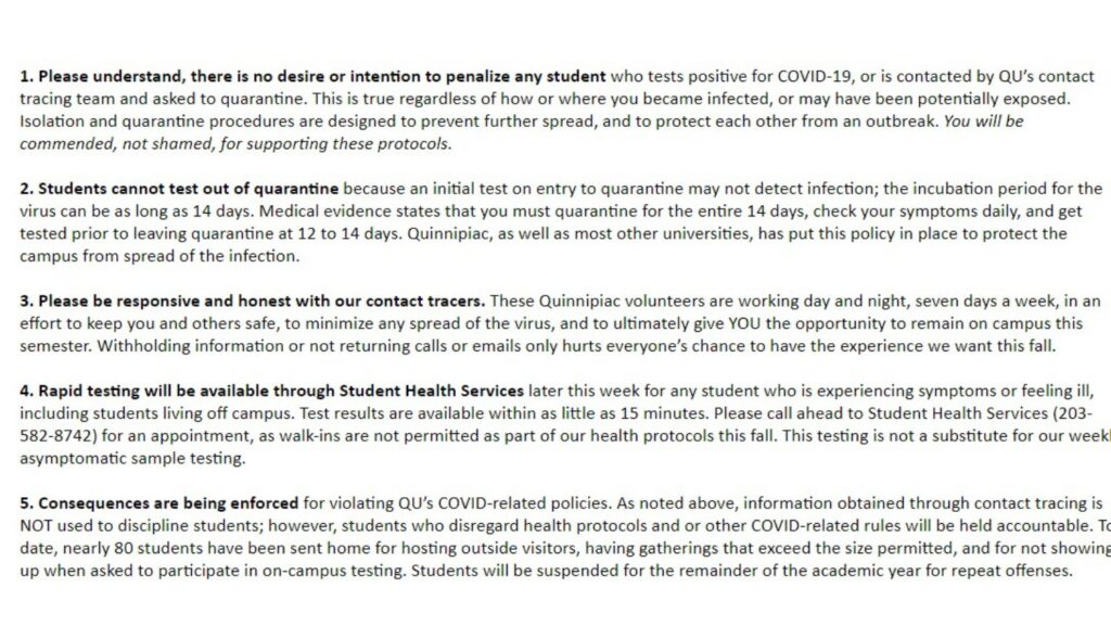 Quinnipiac President Judy Olian released a video announcement to the university today, also urging students to follow the pandemic guidelines the school has in place, and how important it is for Quinnipiac’s future to “reverse the trend and get to Thanksgiving in good health.”