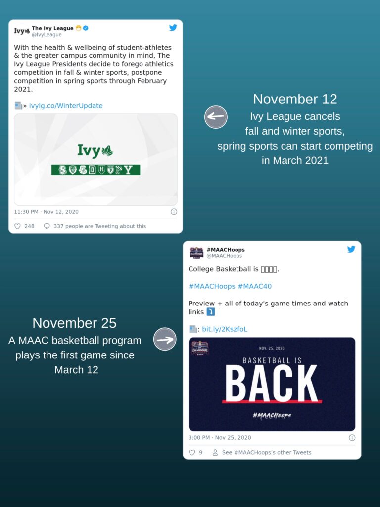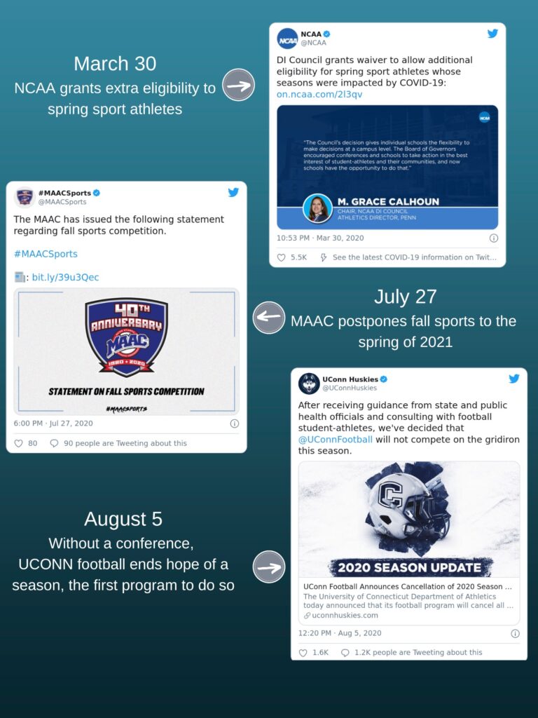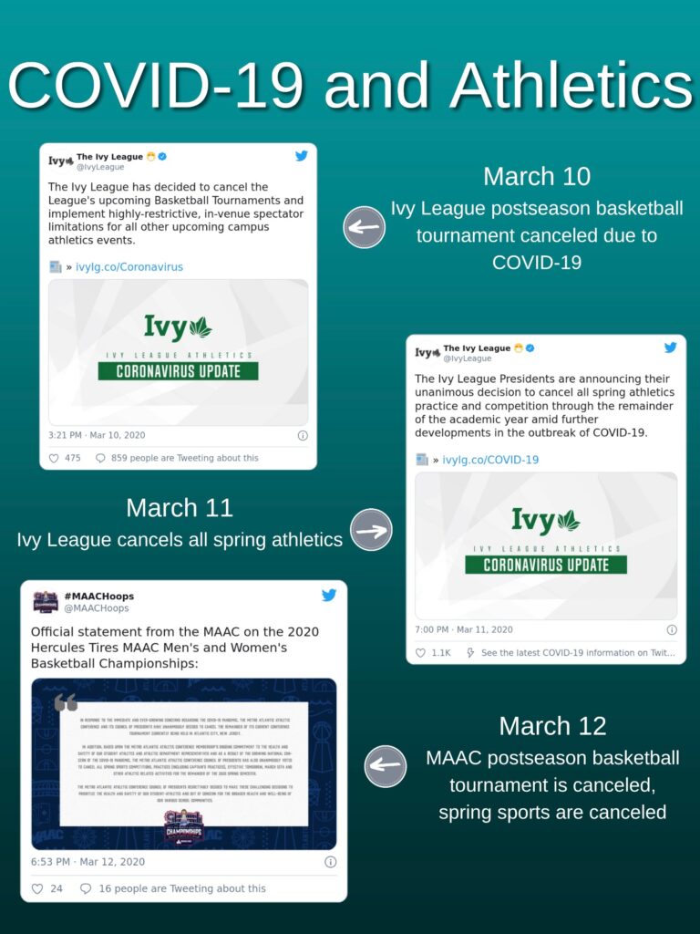 UConn was not the first athletic program to be impacted by COVID-19 in the United States. The schools in the Ivy League dealt the first blow to college sports back in March. The league canceled its mens and women’s basketball postseason tournament on March 10, and a day later, ended all hopes of any spring athletics at Ivy League schools, the first division in the NCAA to end college sports for the rest of the academic year.