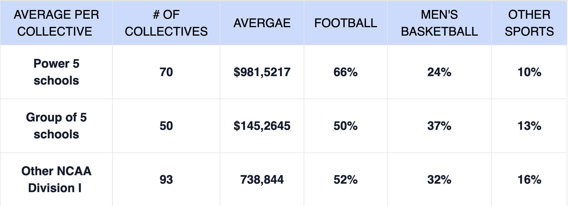 The disparities between Power Four, Group of Five ( American Athletic Conference (AAC), Conference USA (CUSA), Mid-American Conference (MAC), Mountain West Conference (MW), and Sun Belt Conference) and other Division I teams in terms of NIL can be seen when looking at the data. Below is a graph showing on average how much the NIL collectives spend which is the amount of money that these schools spend on NIL.