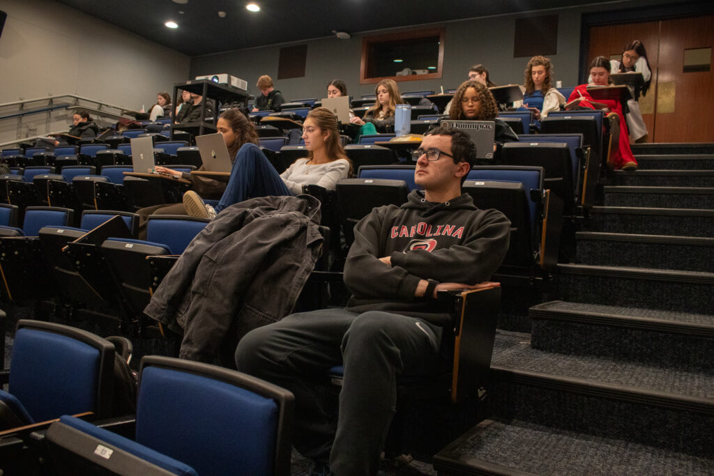 Jake Poet ’26 watches Ralph Gagliardo’s talk with Hands on Hartford, hosted by his organization, CAP. Zach Reagan/HQNN
