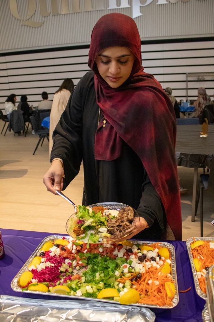 The MSA had a welcome sign outside the auditorium in the School of Business for their final Iftar night of the semester. Zach Reagan/HQNNAmina Farid ’26 scoops some feta salad to fill up her plate at Iftar night. Zach Reagan/HQNNBefore the Iftar meal, Muslim students took time to pray in the auditorium. Zach Reagan/HQNNPresident of Quinnipiac’s Muslim Student Association Riaz Ras ’26, and his fellow executive board members helped pass out food for the final Iftar night of the semester. Zach Reagan/HQNNThe vast food spread for MSA’s Iftar night included this colorful feta salad. Zach Reagan/HQNNMSA’s executive board passed out food for all the students in attendance for their final Iftar night. The marinated chicken proved to be a crowd favorite. Zach Reagan/HQNNQuinnipiac’s Muslim Student Association filled the School of Business auditorium for their final Iftar night before Eid Mubarak. Zach Reagan/HQNNMSA decorated the School of Business auditorium with crescent moon centerpieces, which is a longstanding symbol of Islam. Zach Reagan/HQNN