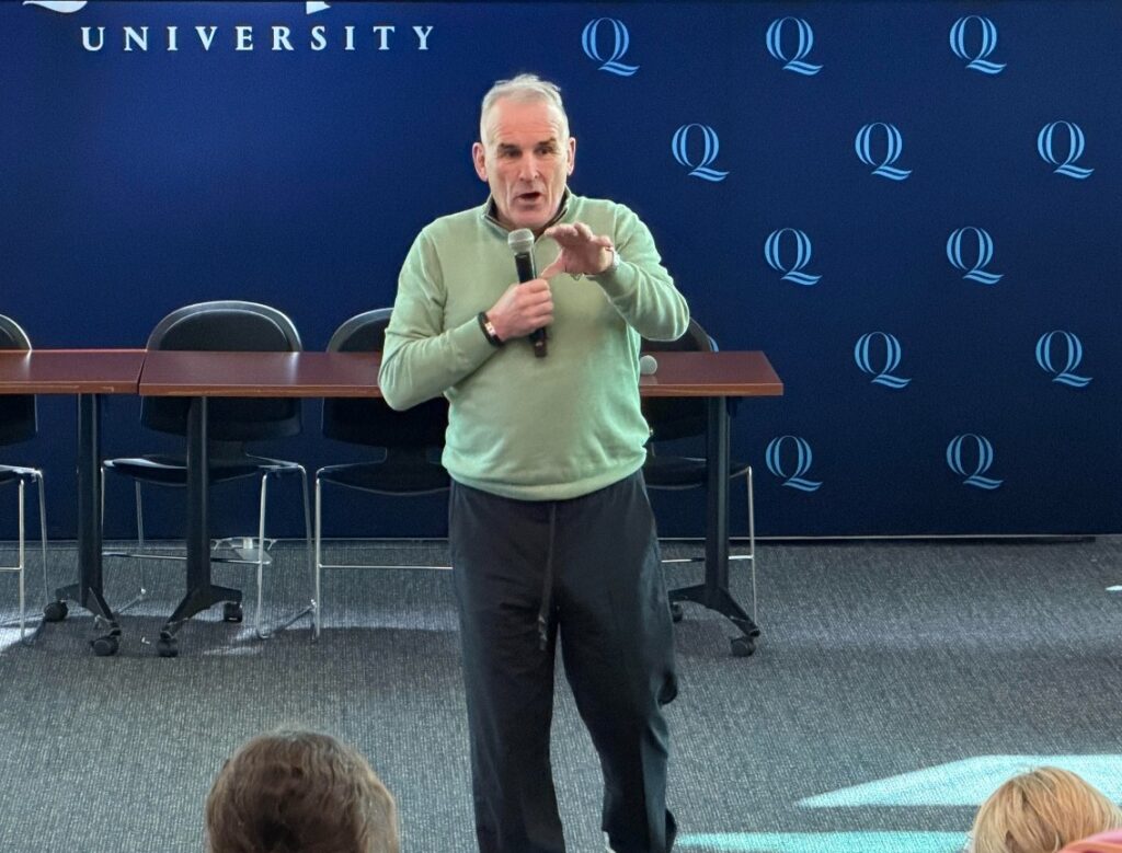 Coming all the way from Belfast, Northern Ireland, Belfast Giants Chair Robert Fitzpatrick spoke to a crowded room of Quinnipiac students in the Mt. Carmel Auditorium at an event organized by the Quinnipiac Department of Athletics on March 25.