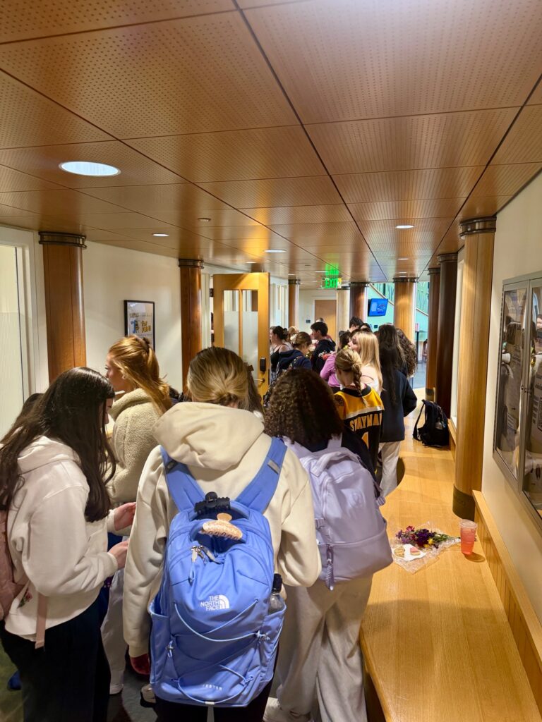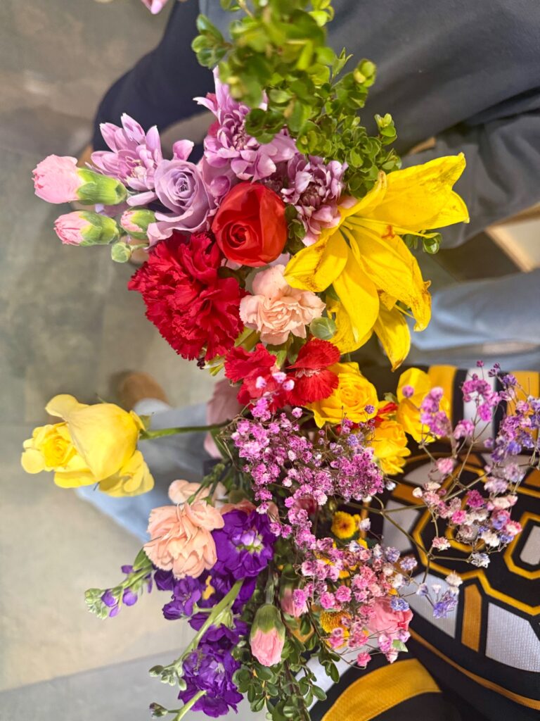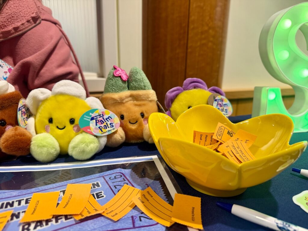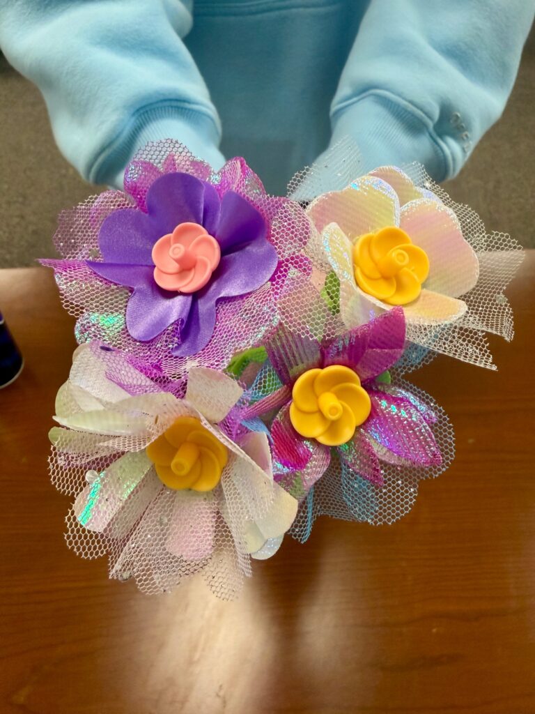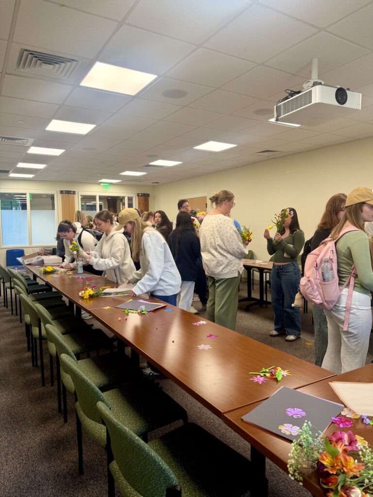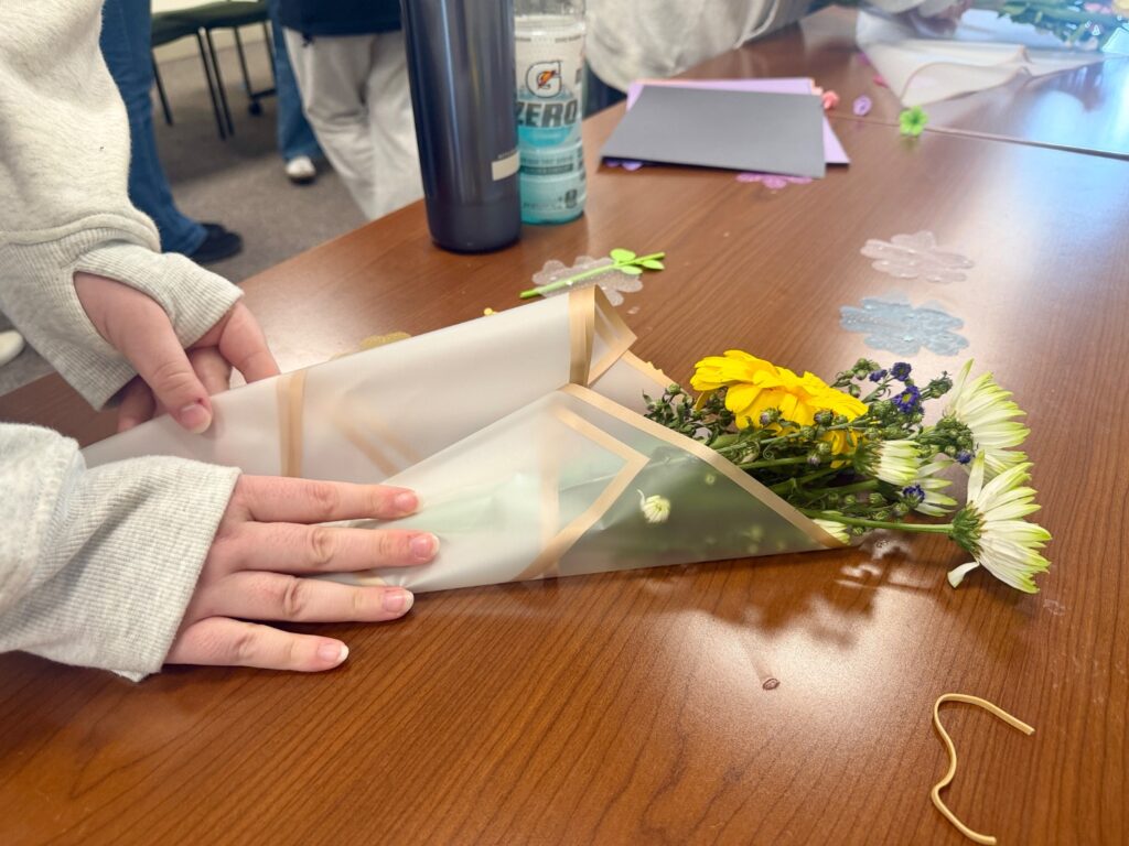 Attending students were met with fresh and faux flowers to create their own unique bouquets. Tables were set up with decorative paper and notecards for students to customize their arrangements for themselves or friends.